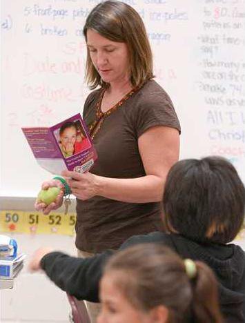 As students enjoy their snacks, teachers tell students how the fruit or vegetable is grown, what minerals and vitamins it has and how it helps them to be healthy.