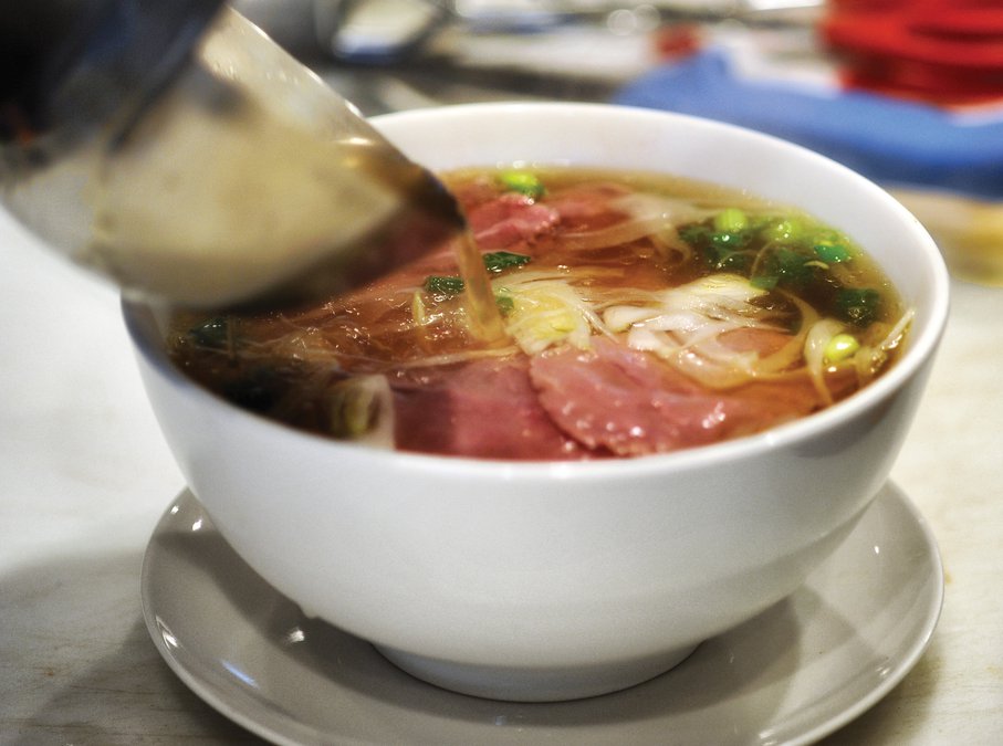 It all starts in a big pot. A cauldron, really. It’s filled with water, fresh ingredients and then set to simmer on low heat overnight. And just like that, the base for pho is made