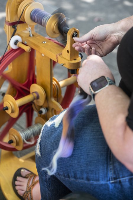 Have you seen a woman with a spinning wheel on the Gainesville square? Here’s what she’s doing