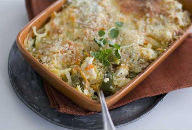 Bagged hash brown potatoes (not the frozen type) can be found in the refrigerator section of your grocer, often near the eggs. Start to finish: 1 hour (20 minutes active) Servings: 8 1/2 cup light mayonnaise 10 3/4-ounce can condensed cream-of-chicken soup 1/2 cup milk 1/4 teaspoon ground black pepper 1/2 teaspoon salt 1/2 teaspoon dried thyme 1/2 teaspoon garlic powder 20-ounce package hash brown potatoes 1 medium zucchini, diced 1 cup green beans, cut into pieces 1/2 cup grated carrot Meat from a 2-pound rotisserie chicken, cubed, skin and bones discarded 3/4 cup shredded cheddar cheese 1/2 cup panko breadcrumbs Heat the oven to 400 F. In a 9-by-13-inch baking dish, stir together the mayonnaise, soup, milk, pepper, salt, thyme and garlic powder. Stir in the potatoes, zucchini, green beans, carrots and chicken.