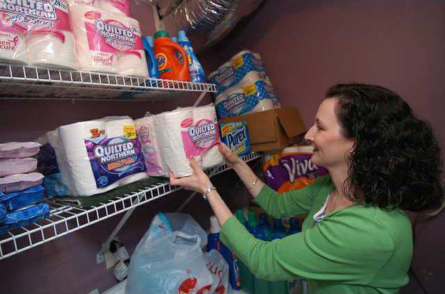 One goal of couponing is to "stockpile" things when they are at their lowest prices so you never have to pay full price for them again. This practice has resulted in our basement resembling a small convenience store. Thus, we have been able to share much more than we otherwise could with those struggling during these trying financial times. It is nothing now for us to fill up several bags with food and toiletry items for a family in need or to bless a new mom in our church with a gift basket of fun items.