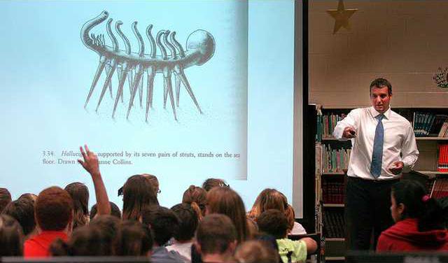 He also told the North Hall kids about one of his own teachers, Stephen Jay Gould, who challenged Darwin's theory of gradual evolution with the theory of punctuated equilibrium, which proposes that species are generally stable for millions of years until a rapid burst of change results in a new species.