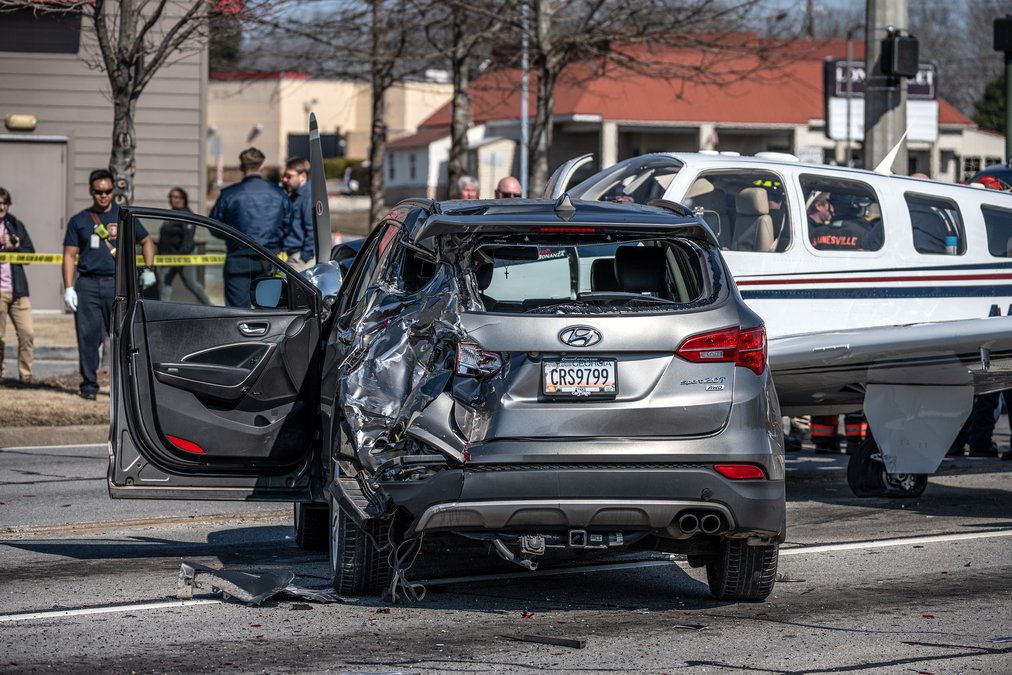 A single-engine plane crashed into multiple cars after making an emergency landing Monday near the intersection of Browns Bridge Road and Pearl Nix Parkway, according to police.