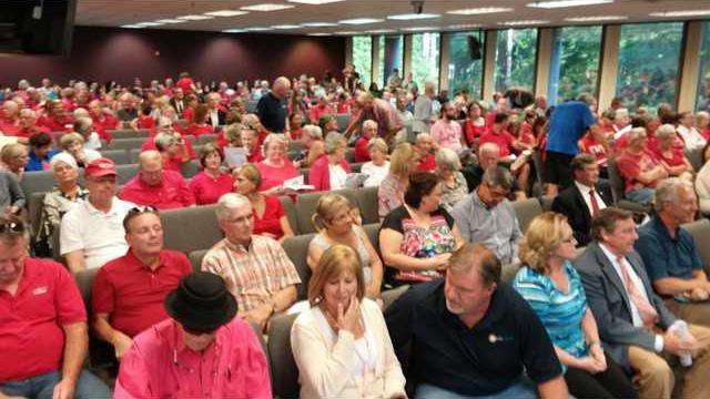 Mincey Marble’s rezoning proposal for a new plant in West Hall now will be heard by the Hall County Board of Commissioners on Oct. 13. The board voted Thursday night on the delay but also agreed with Commissioner Jeff Stowe’s suggestion that “there will be a public hearing at that point or (the proposal) will be withdrawn by the applicant.” Upon hearing the suggestion, applause broke out across the audience, which included some 150 people who showed in opposition to Mincey’s plans, many wearing red shirts.