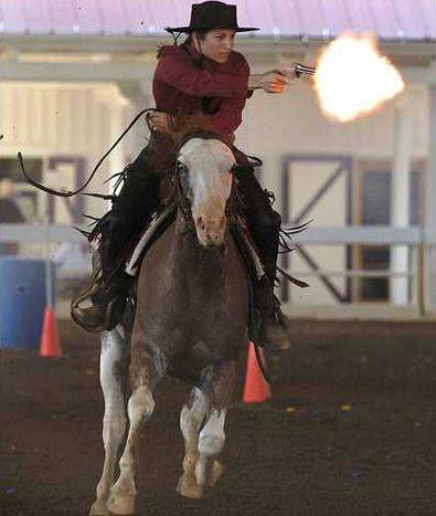 Stetson-wearing cowboys and cowgirls astride galloping horses take aim with their six-guns and blast away at their targets.