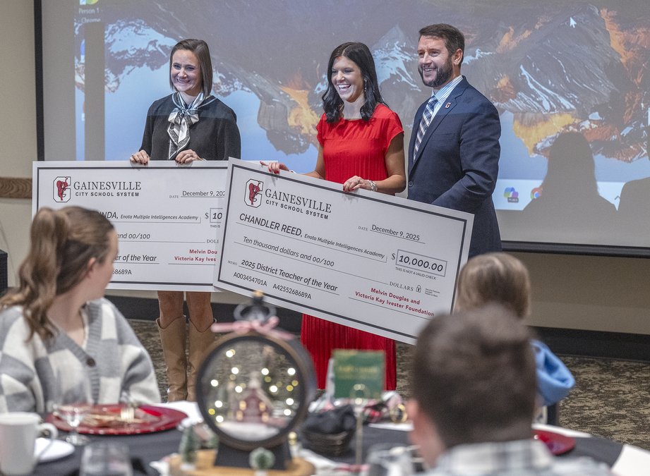 The teachers of the year for the Hall County and Gainesville school districts were honored Tuesday, Dec. 9, during an annual luncheon where each received $10,000 from the Melvin Douglas and Victoria Kay Ivester Foundation.