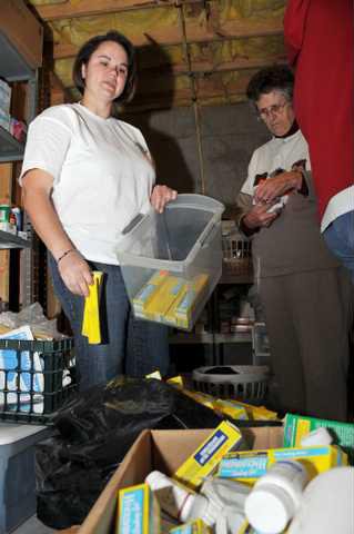 Jessica Matthews of Helping Hands Foreign Missions and others worked Tuesday at a South Hall home to pull together medical supplies the group keeps in storage, throwing out products that have expired.