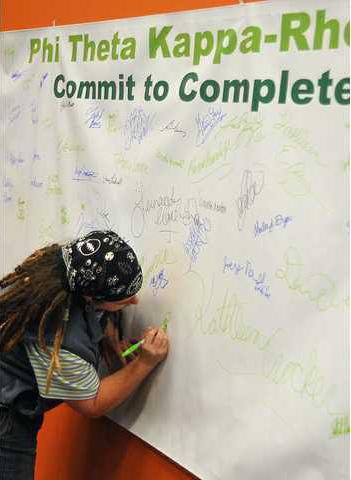 Although there are a multitude of reasons some students don’t finish their higher education, Phi Theta Kappa members at Gainesville State College implemented a project Monday in hopes of encouraging classmates to complete their degrees. The college’s Phi Theta Kappa Rho Mu chapter, in conjunction with the Community College Completion Corps, invited students to sign a banner in the school’s student center pledging to finish their associate’s degrees and certificates. While faculty and staff also had the opportunity to sign, more than 125 students committed to the pledge during the one-day event, according to Tonya Richardson, chapter secretary.