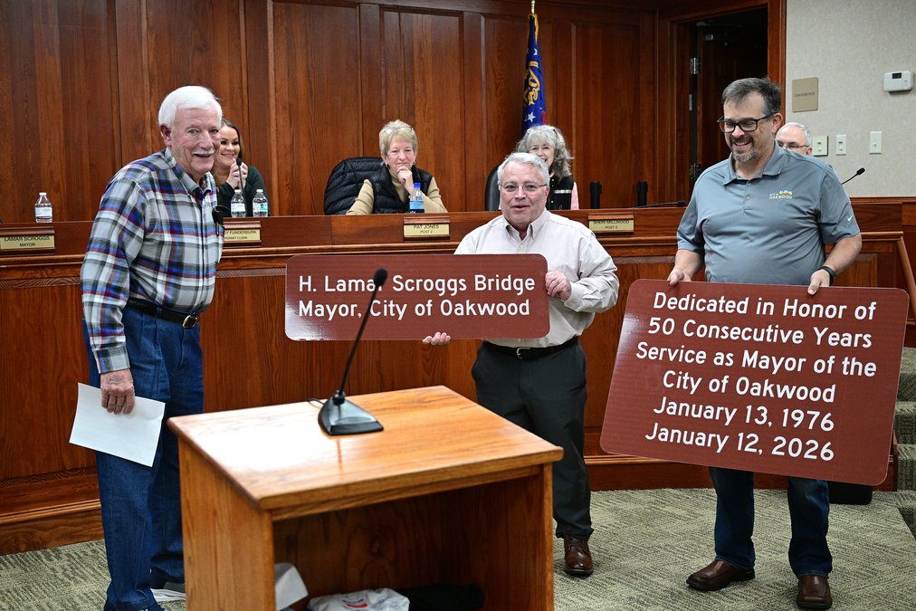 A busy bridge over Norfolk Southern railroad tracks is being named in honor of Oakwood Mayor Lamar Scroggs, recognizing him for 50 years as mayor.