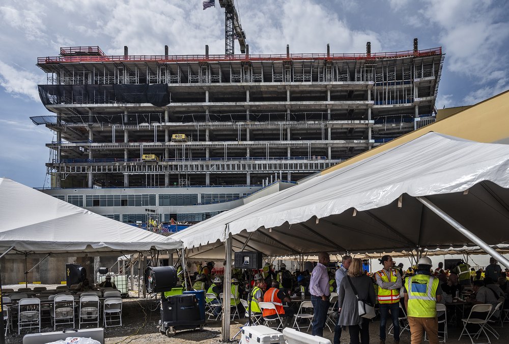 Construction crews on Friday, July 21, installed the final piece of the frame of the Northeast Georgia Medical Center's new $538-million North Tower in Gainesville, which is expected to be the third-largest hospital in the state once it's completed.