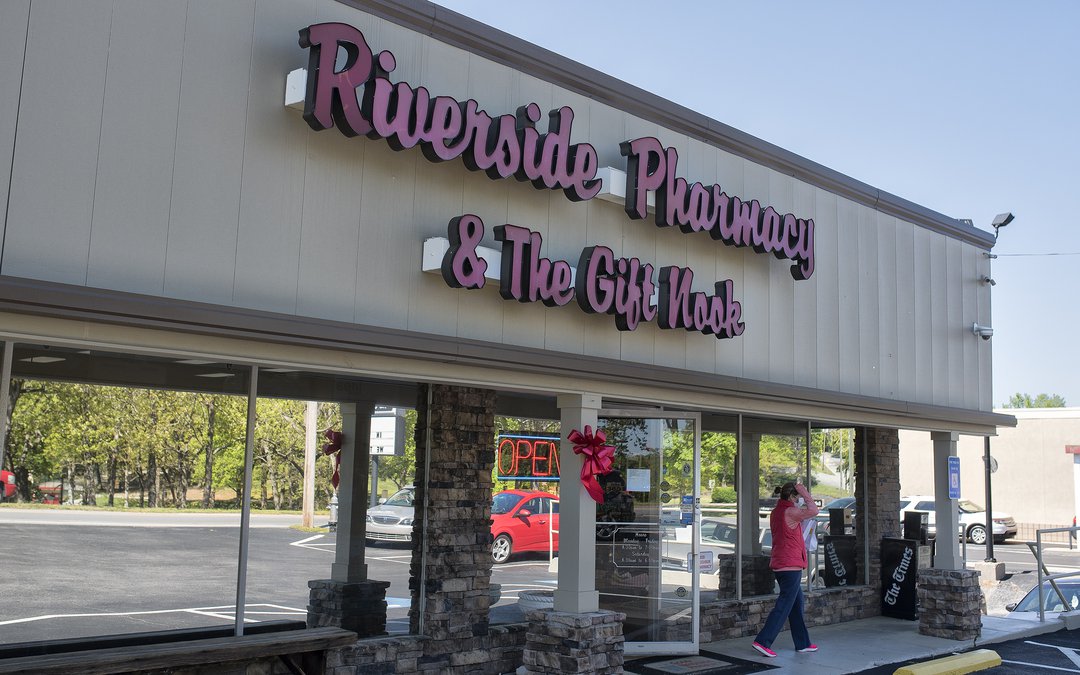 Barriers are in place at the cash register and the prescription drop-off area at Riverside Pharmacy on Green Street in Gainesville.