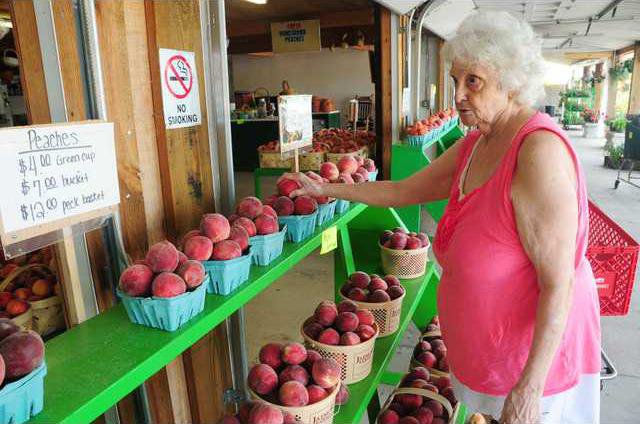 Mary Kubeck drove from Hoschton to shop for Jaemor peaches.