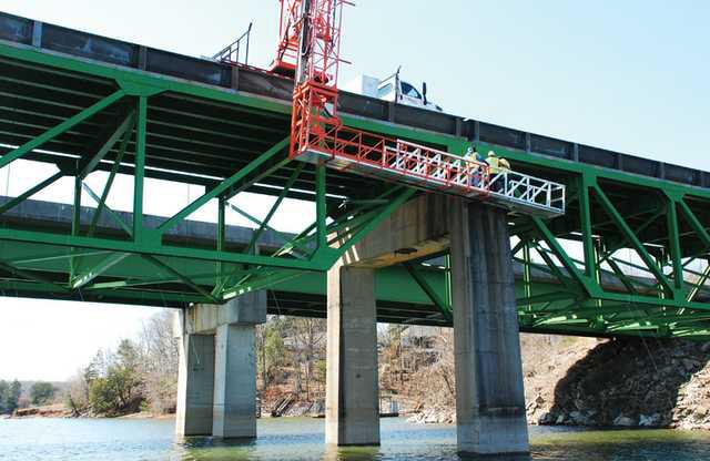 Two years ago, temporary repairs were made to the westbound bridge on Ga. 53/Dawsonville Highway crossing the Chattahoochee River portion of Lake Lanier. The Georgia Department of Transportation is working to develop a more lasting solution, one that may extend beyond the ever-cracking driving surface. Using a piece of equipment known as a “snooper” that can carry a person under the structure, workers are examining the bridge top to bottom.