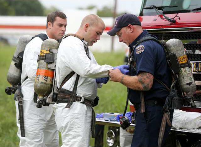 Police used cutting tools to get into the heavily wooded area behind El Taco Veloz on Jesse Jewell Parkway. Gainesville Fire Division Chief Keith Smith led five officers in disposable coveralls and breathing apparatuses to approach the remains.