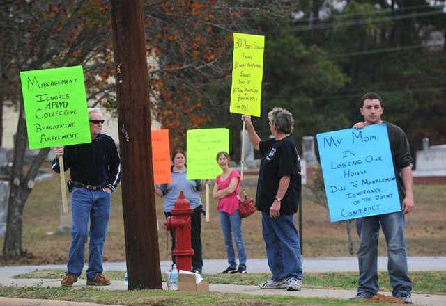 Five picketers stood on the sidewalk off Atlanta Highway in front of the post office at noon on Monday.