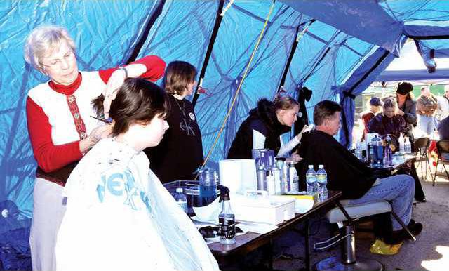 There, visitors signed in at registration tables before moving on to grab a hamburger or hot dog and sit at dining tables, then visit covered areas providing health and beauty services.