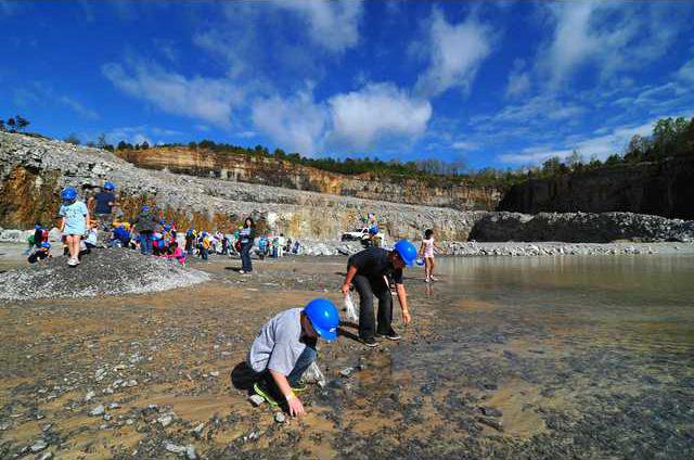 A group of children, each wearing a blue hard hat, crouched at the edge of a puddle looking for unusual rocks inside of a 6-year-old pit mine operation Friday morning in Gainesville. Other groups walked around large granite boulders asking equipment operators how they use tractors and dump trucks to move the huge rocks from place to place. Five third-grade classes from Sardis Enrichment School took a field trip to the Hanson Aggregates, a rock quarry on Candler Road in Gainesville, to reinforce recent classroom lessons on rocks, gems and minerals.