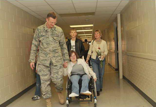 The reunion was a tearful one for Jordan, 16, whom he described as "daddy’s little girl." Collins usually is the one to take wheelchair-using Jordan to school, but while he was in Iraq, his wife Lisa took over that responsibility.
