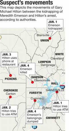 From Union County, the site of her abduction, Hilton drove to Gainesville, stopping at an ATM on E.E. Butler Parkway at about 9:30 p.m. to try to use one of the 24-year-old hiker's bank cards, investigators believe. The following day, Jan. 2, she was reported missing by a roommate. That night, about 8:30 p.m., Hilton was seen on surveillance video trying to use one of Emerson's credit cards at a Regions Bank ATM in Canton, authorities have said.
