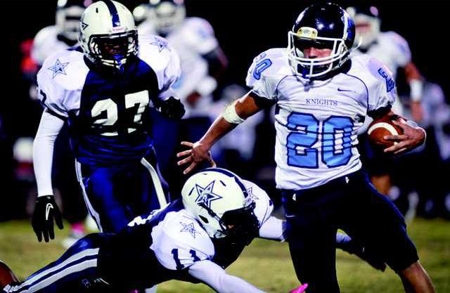 A.J. Millwood finished with 22 carries and 121 yards for the Knights. He scored on a run from the 4 late in the first quarter to tie the score at 7-all. Then he scored on a run from the 10 with 9:30 left in the first half to give the Knights a 14-7 lead.