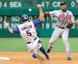 Michael Young hit what appeared to be a double-play grounder to second base, but Kinsler made a strong slide to prevent shortstop Yunel Escobar from making a good relay throw while Laird scored. Hudson, Teixeira and Cox all argued that it was interference, to no avail.