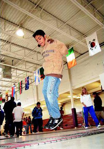Patterson was especially interested in hamming it up with the kids as they ran through the course as dictated by a video monitor on the gym’s stage. And when kids were attentive to their message after working up a sweat, he stressed the importance of studying, making good grades and regular exercise.