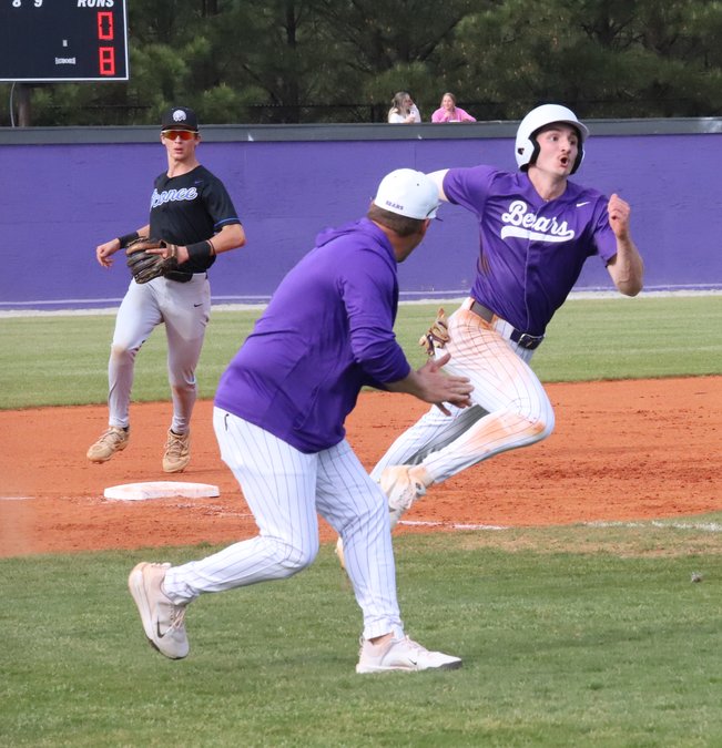 Cherokee Bluff's Brody Hurd (2) rounds third and scores against Oconee County on April 3, 2026 in Flowery Branch. Photo by Bill Murphy