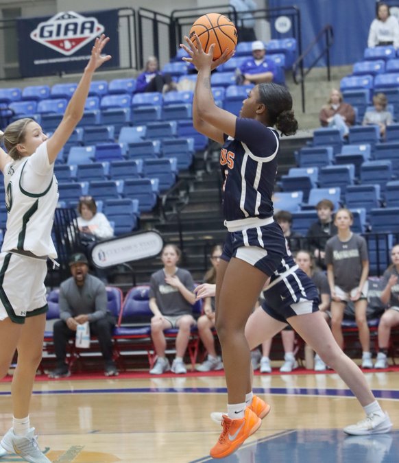 Lakeview Academy's Emyrie Combs goes up for a jump shot during the Lions' GIAA Class 3A state semifinal game against St. Andrew's on Feb. 25, 2026 in Columbus. Photo by Bora Ozcelik For The Times