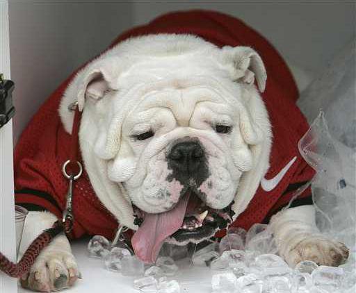ATHENS — Wearing a red "G" jersey, a pure white English bulldog calmly trotted across green turf to be collared the University of Georgia's new mascot.