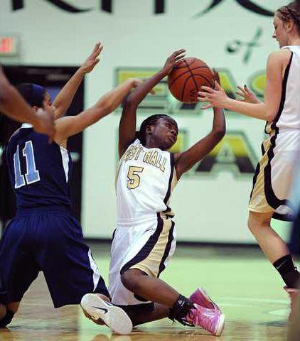 Following two offensive turnovers by Lovett, Jasmine Jenkins went up and hit two free throws to put East Hall ahead 43-42, its first lead since it was 7-6 after Jenkins hit a 3-pointer late in the first quarter.