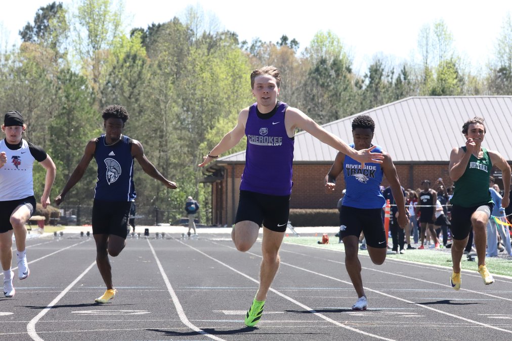 Cherokee Bluff's Will Jacobs runs to victory in the 100-meter dash during the Hall County championships on March 28, 2026 at Chestatee High in Gainesville. Photo by Bill Murphy