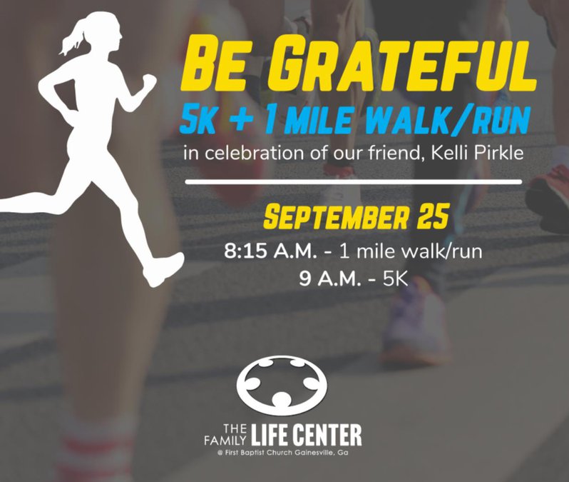 The Family Life Center of First Baptist Church in Gainesville is holding the ‘Be Grateful 5K and one-mile Walk/Run’ at 8:15 a.m. on Sept. 25 at the Midtown Greenway in Gainesville. The race will be held in memory and a celebration of life for former member Kelli Pirkle. The cost to participate is $20 for the fun run and $30 for the 5K run/walk.